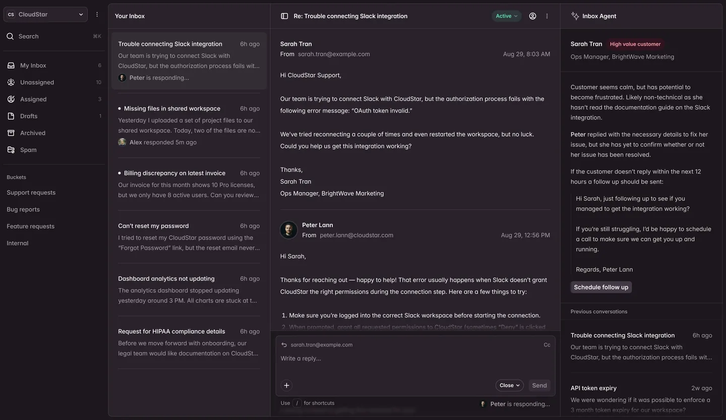 IMAP polling with sentiment classification. AI drafts responses for your review.